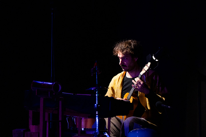 Kent, with whom I have worked on all projects that required music (my two animated films and my first play), can do anything. He can play the piano and percussion at the same time, he can play a saw (!), he can act, write and improvise beautiful pieces of music, with the standard of someone trained in classical music. (And bake me an apple crumble as a gift the day after I almost burst into tears from exhaustion and anxiety.) He plays 11 different instruments on stage, and the play is nothing without his artistry. He is both an anchor and a sailor.