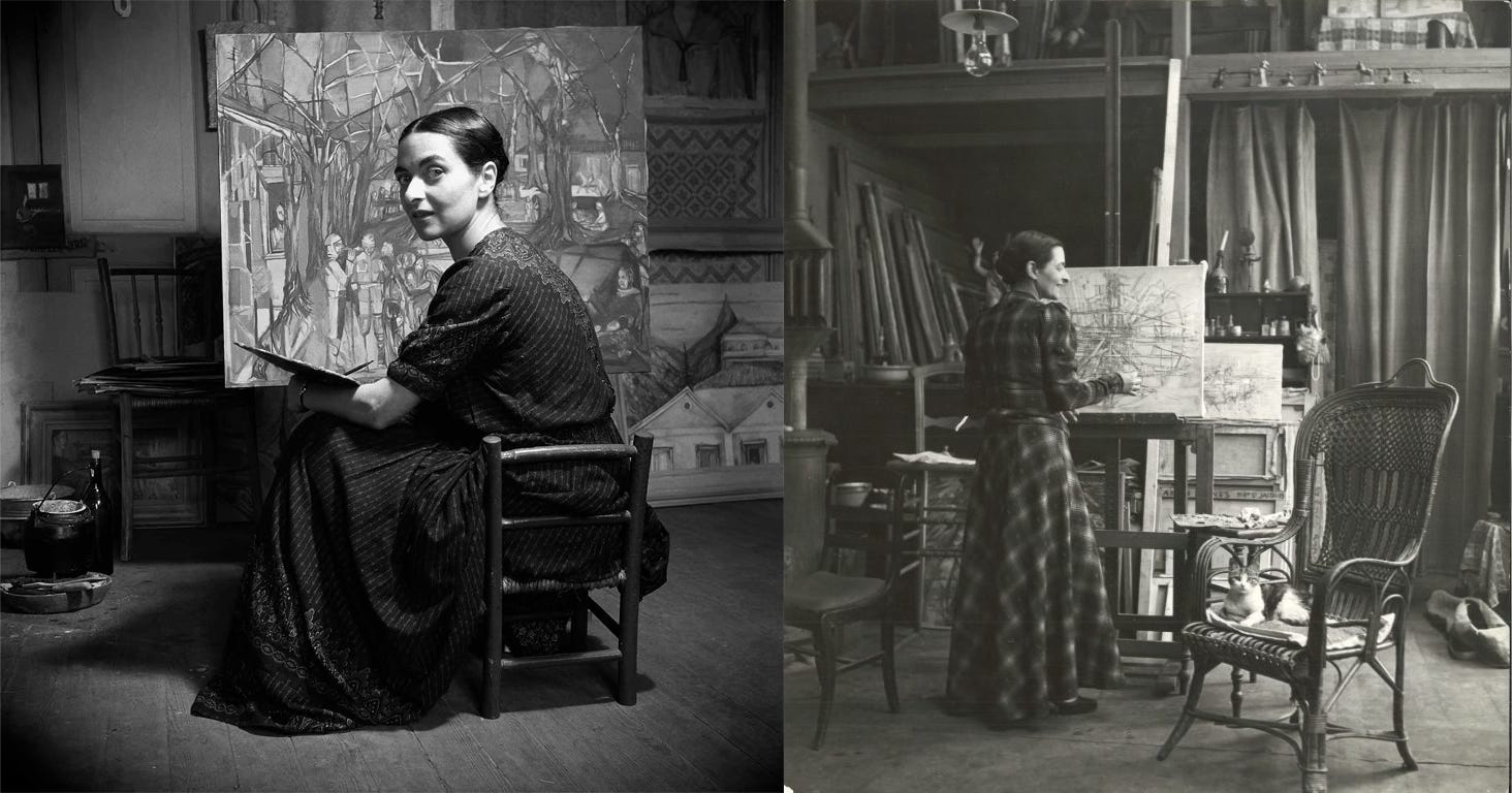 While the second photograph seems a candid shot, the first one was clearly thought out. Viera da Silva sits in a posture perfectly balanced in the shot, her torso framed by her own work in progress. The light baths her from an upper left angle, which separates her for the carefully placed elements in the background, like the bottle and the pot. A reverse image search reveals the author to be Hungarian photographer Carlos Moskovics.