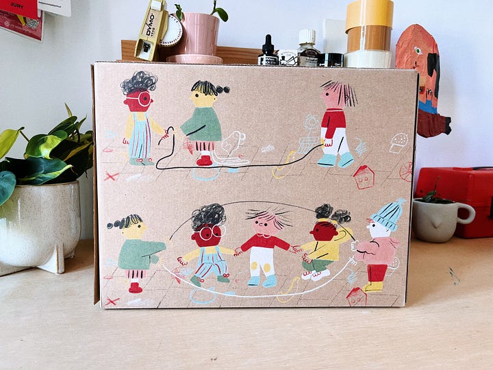 I also illustrated (a few months ago, but they’ve only just been printed now) gift boxes for a children’s clothing brand. I’m not proud of having worked for a children’s clothing brand, no. We already have enough clothes on the planet to last six generations. But they had this concept, ‘rising together’, which I thought was salvageable; I felt I could turn it into a narrative about collective power.
